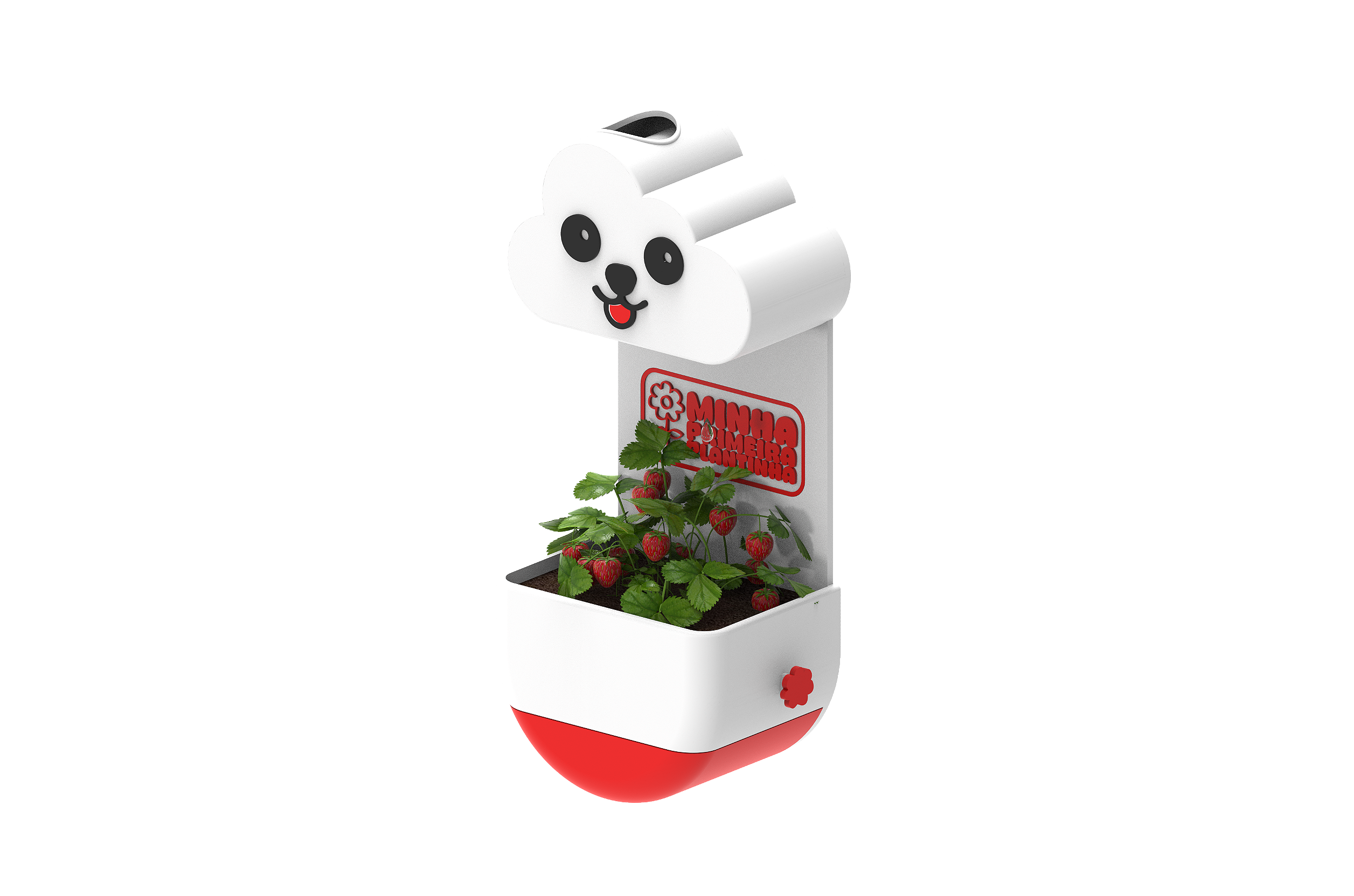 O kit vem com o vaso nuvem, suporte para parede com parafuso e bucha, sementes de morango, substrato e regador.