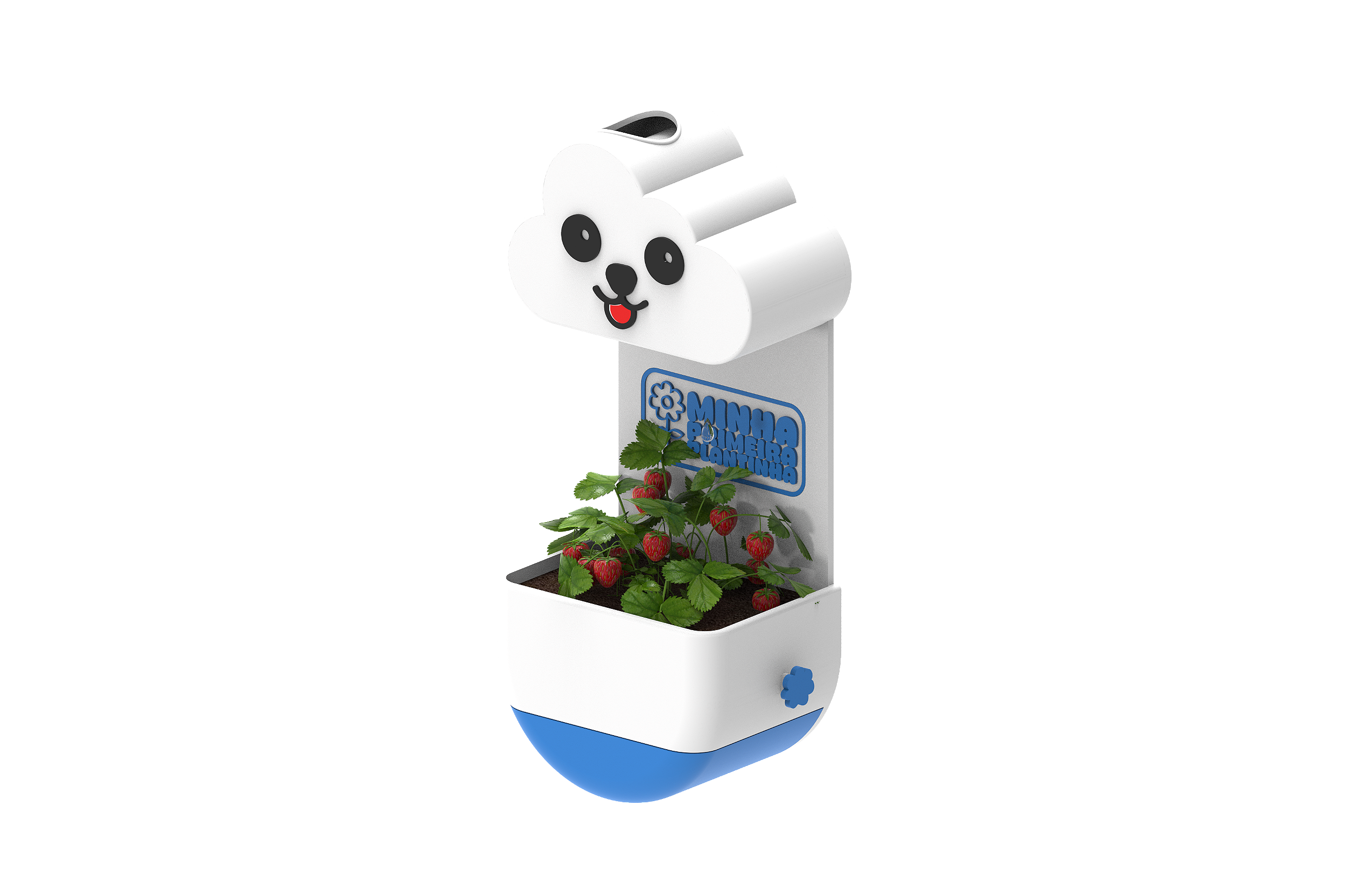 O kit vem com o vaso nuvem, suporte para parede com parafuso e bucha, sementes de morango, substrato e regador.