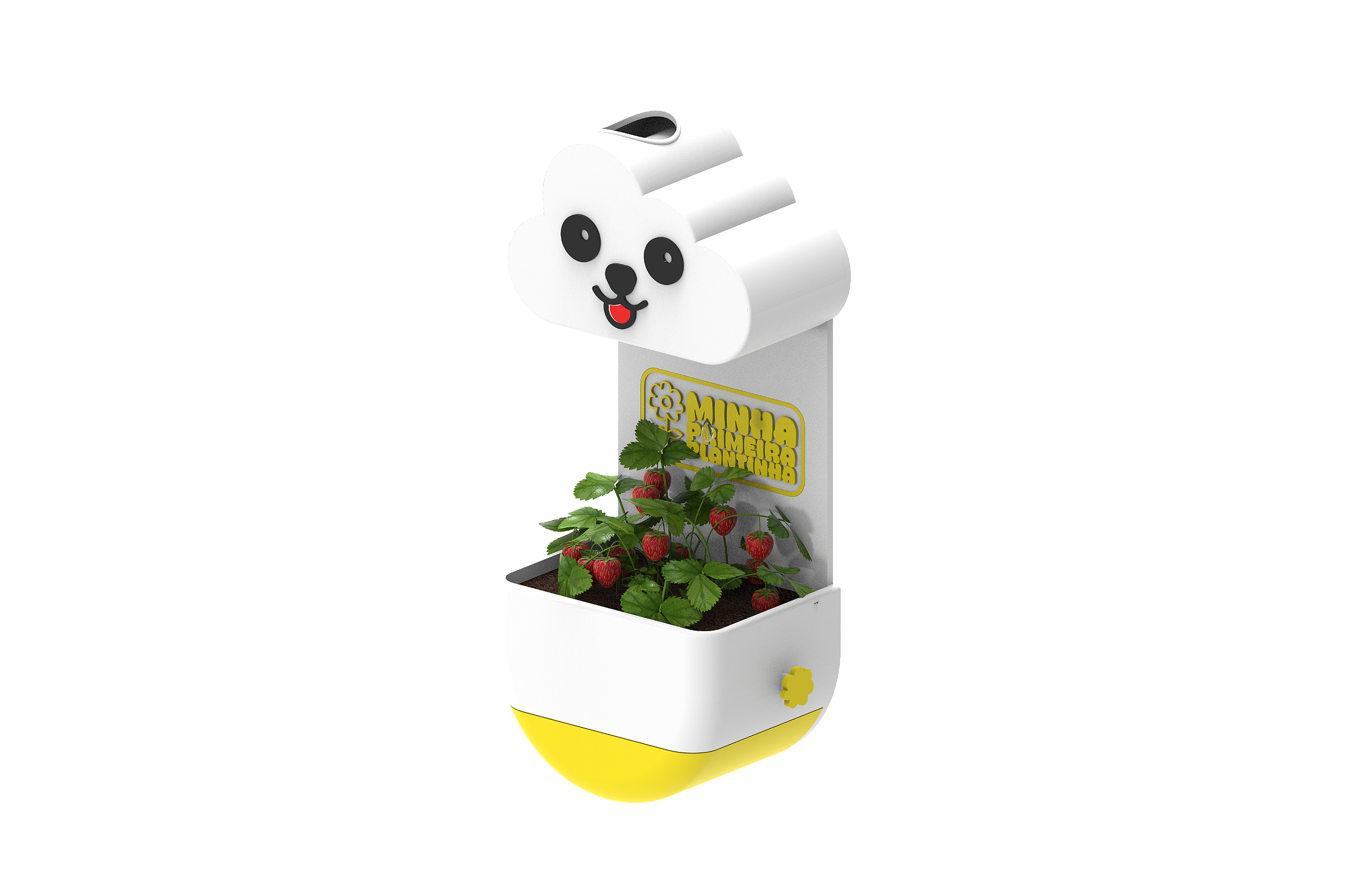 O kit vem com o vaso nuvem, suporte para parede com parafuso e bucha, sementes de morango, substrato e regador.